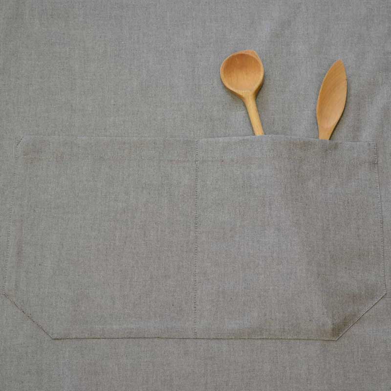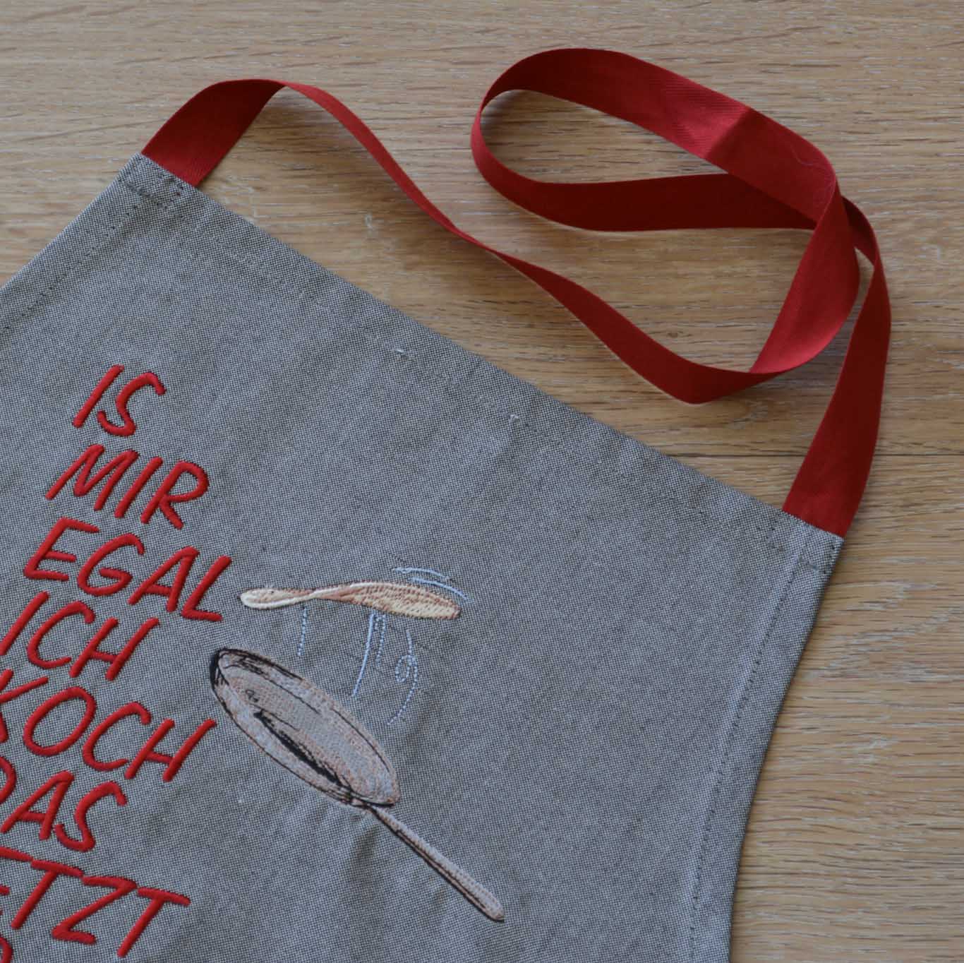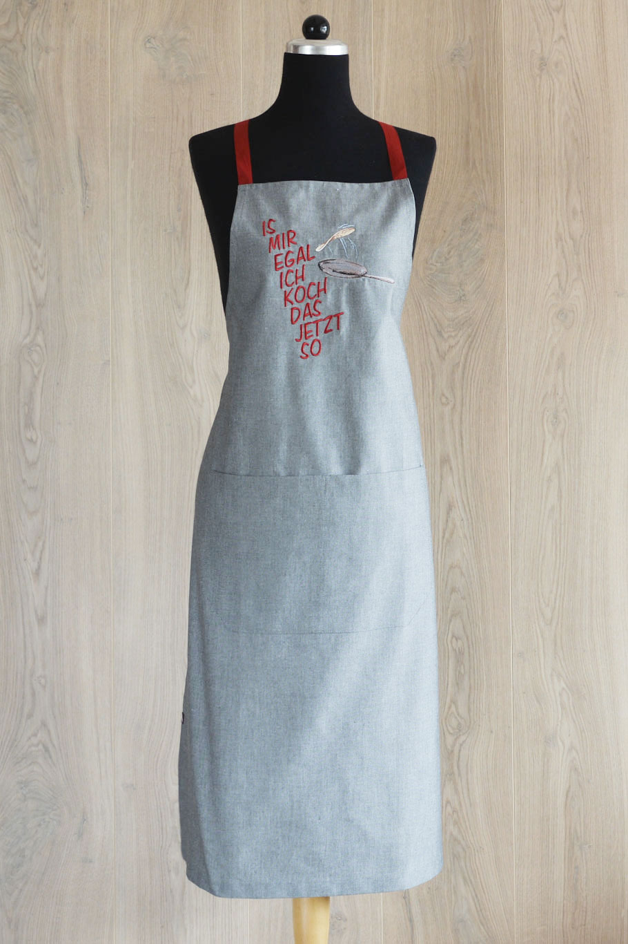 Eine Schürze mit gesticktem Spruch für den nächsten Kochevent. Dank der praktischen Taschen ist alles griffbereit. Die Länge des oberen Bandes kann durch einen einfachen Knoten individuell eingestellt werden.