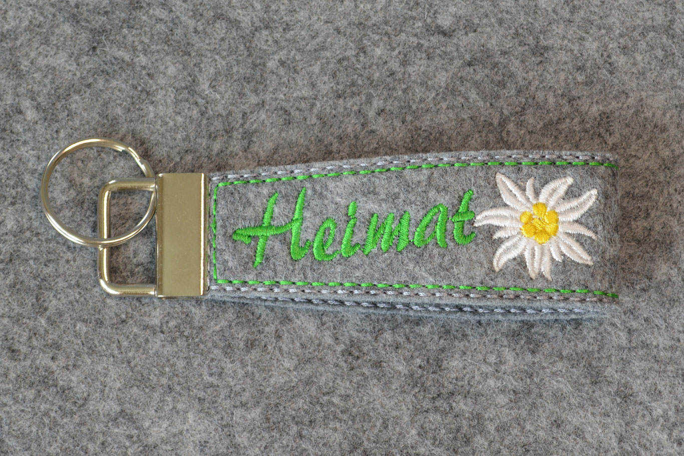 Bestickung auf Vorderseite: "Heimat mit Edelweiss"